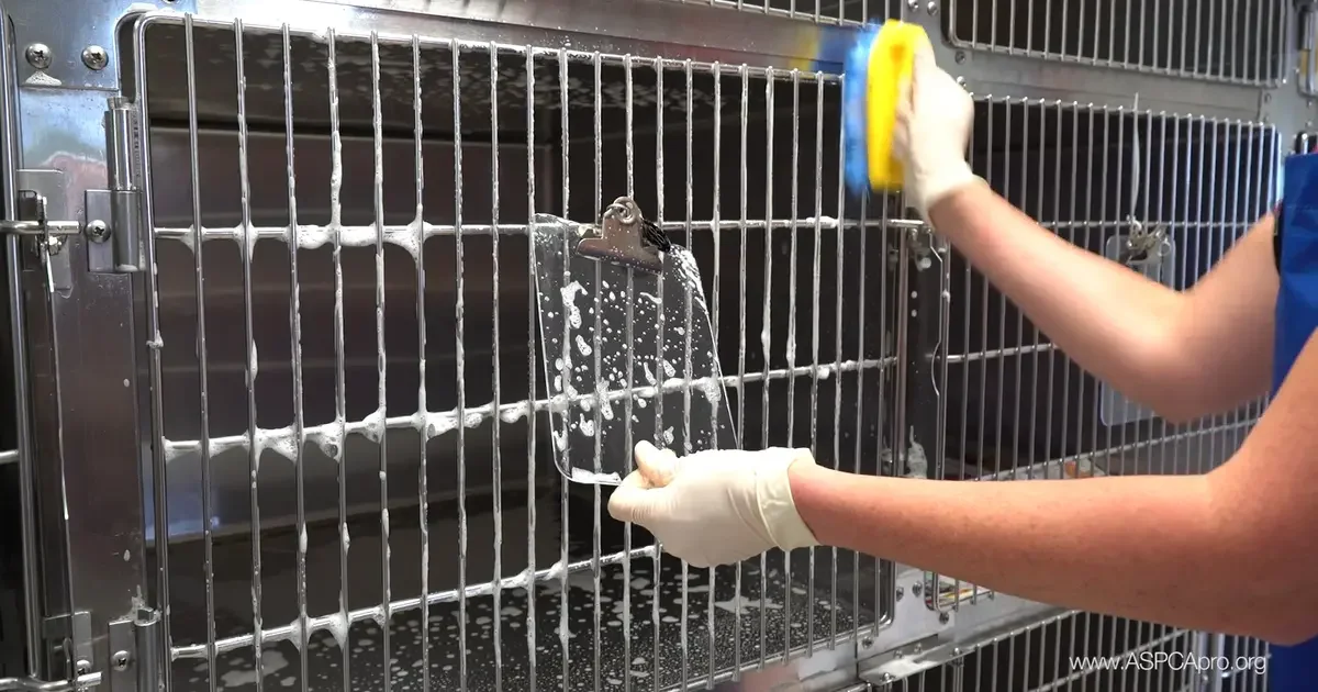 Cleaning kennels, cages, litter boxes, and common areas